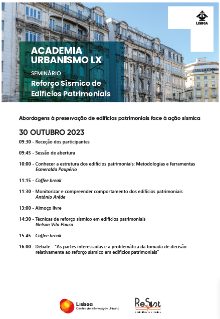 No próximo dia 30 de outubro, terá lugar no Auditório do Centro de Informação Urbana de Lisboa (CIUL) – Picoas Plaza, um Seminário visando a discussão das abordagens à preservação de edifícios patrimoniais face à ação sísmica.